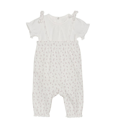 Fixoni Baby Girl Organic Ribbed Cotton Overalls in Botanical Print on White: Size 0M to 12M
