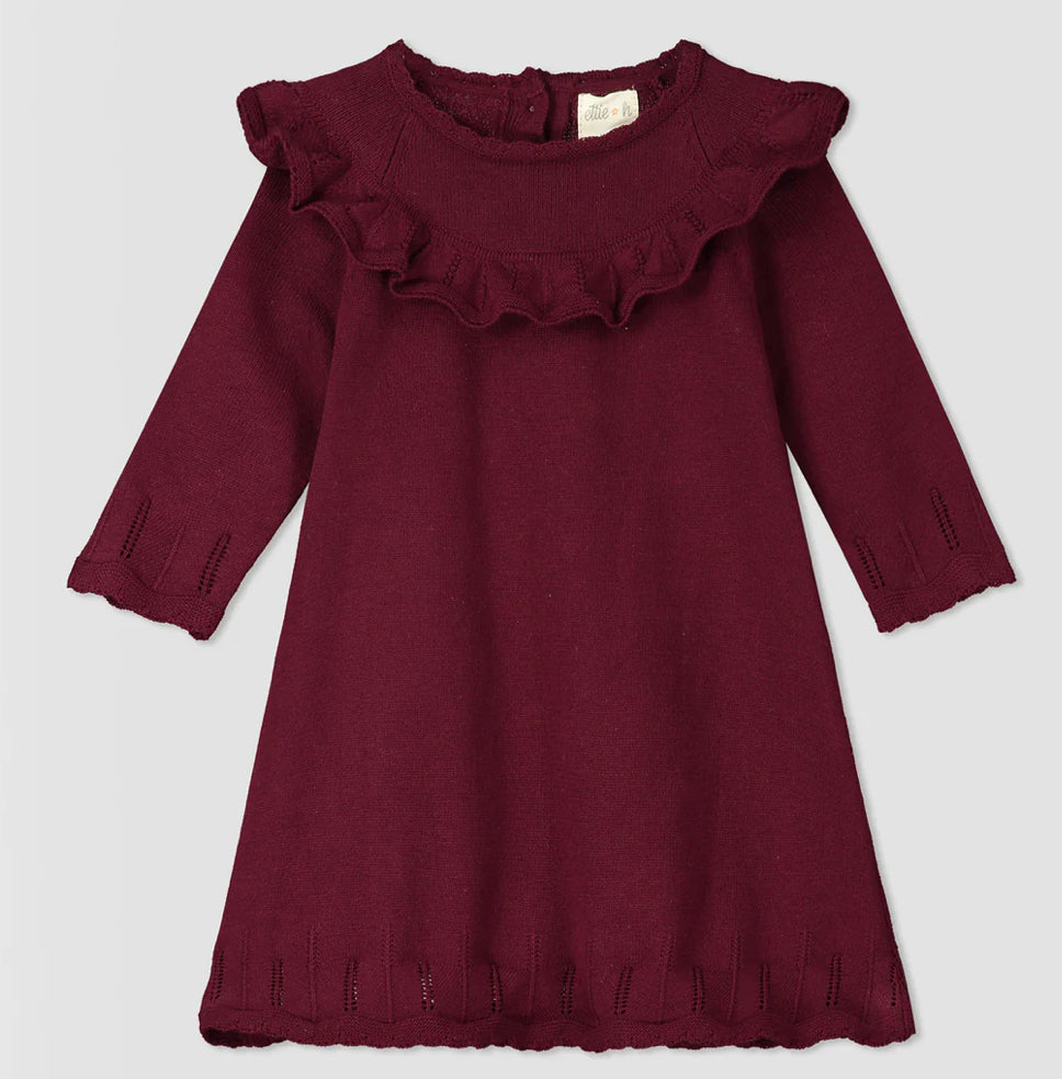This dress's darling frilled collar and luxoriously comfortable burgundy knit jersey makes it a cute and comfortable look.