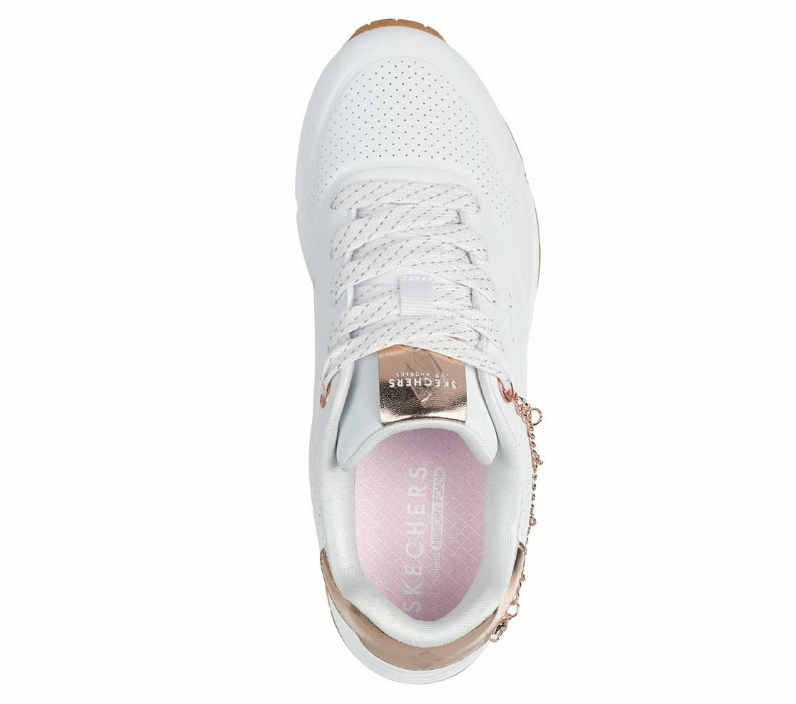 Dazzle their feet with Skechers Street™ UNO Gen1 - She's Charming. This lace-up fashion design features a synthetic upper with metallic trim, an attached shoe bracelet with thematic charms, Skechers Air-Cooled Memory Foam® comfort insole, and a visible Skech-Air® airbag midsole.