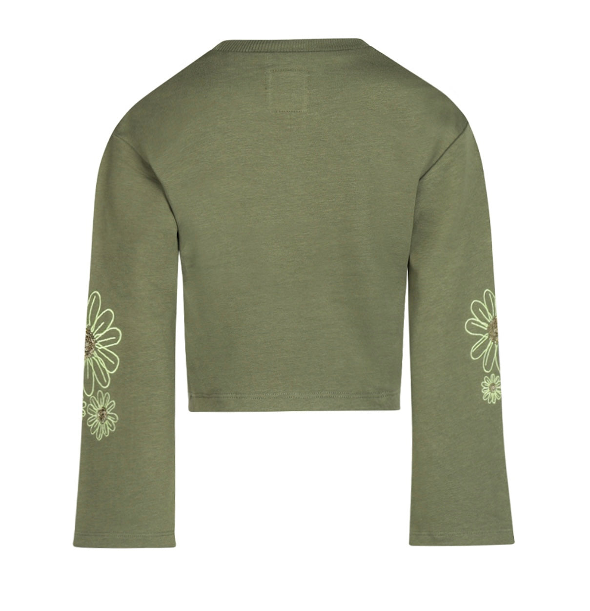 This retro style cropped sweater in army green is a real eye-catcher for girls who love cool and stylish. The dropped shoulders give the jumper a relaxed fit, while the wide sleeves with embroidered flowers and sequins add a playful detail. The cropped style makes the jumper extra trendy and perfect for pairing with high-waisted trousers or skirts. Sizes up to 86 have press studs on the shoulders.